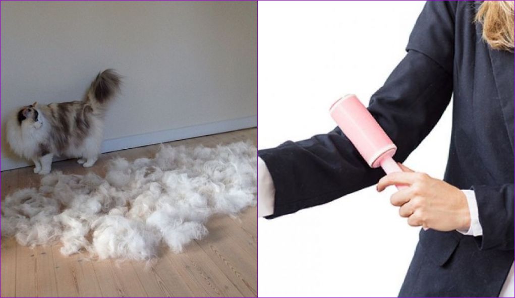 Gatinho escovado com a escova furminator e rolo adesivo para roupas nas respectivas ordens.