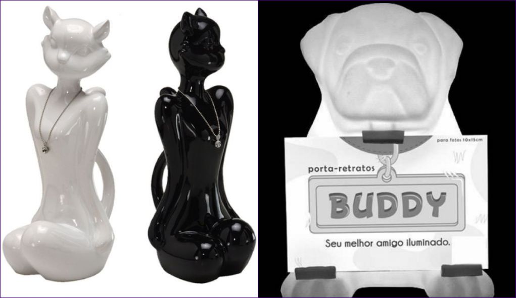 A duplinha de gatinhos, você encontra no site do Carrefour e a luminária de cachorro com porta-retratos, tem disponível no site Cat Club.