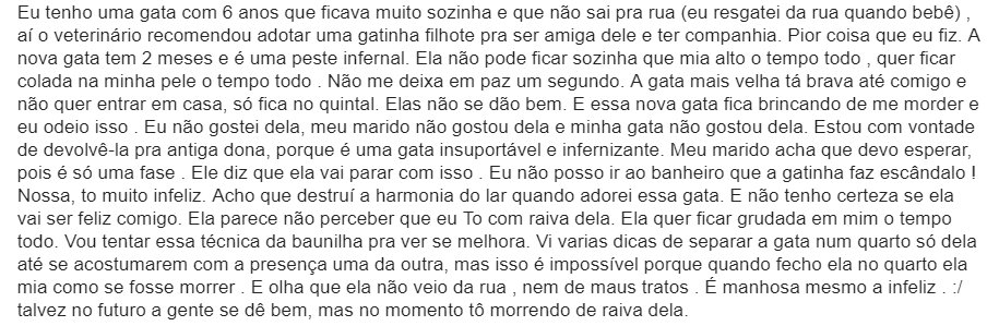 Não pense que foi uma atitude fácil, estou destruída por dentro, pois não tinha raiva do bichinho, tinha pena de ela estar em sofrimento aqui em casa por não se adaptar.