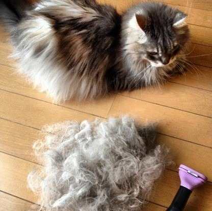 O que também pode ajudar muito, é passar um paninho úmido uma vez ao dia. Toda manhã eu levo a Ruby pra passear pelo quintal. Ela brinca com terra, rói meus temperos e sempre que terminamos, passo um paninho úmido (quase seco) nela. Percebi que com o tempo a quantidade de pelos voando pela casa reduziu e consequentemente, os que ela ingere também.